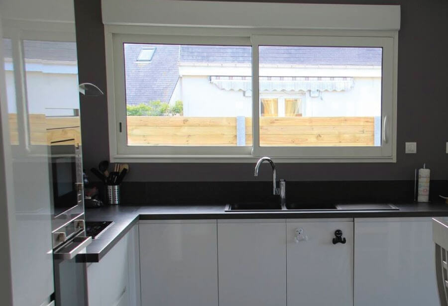 La maison a la chance de posséder de belles ouvertures sur l’extérieur, avec très peu de vis-à-vis. C’est pourquoi nous avons tout de suite proposé à Sébastien et Marie de partir sur de larges baies vitrées pour gorger le salon et la pièce à vivre de lumière. Sur trois bandes, ils ont opté pour les baies vitrées à ouverture coulissante, en ALU blanc avec un triple vitrage pour conserver une isolation thermique de qualité. Dans les chambres et la salle de bain, ce sont des fenêtres à ouverture oscilla-battante qu’ils ont préférée pour avoir la possibilité d’aérer la pièce sans qu’il y fasse trop froid. Résultat, la maison est très lumineuse et nous avons peu les accompagner au bout de leur projet !